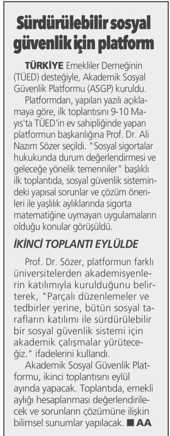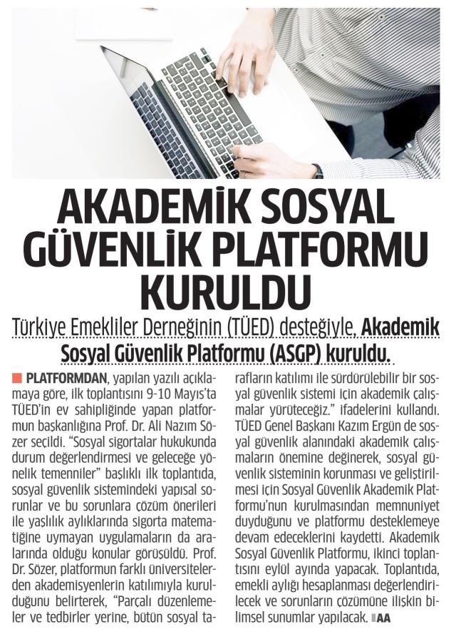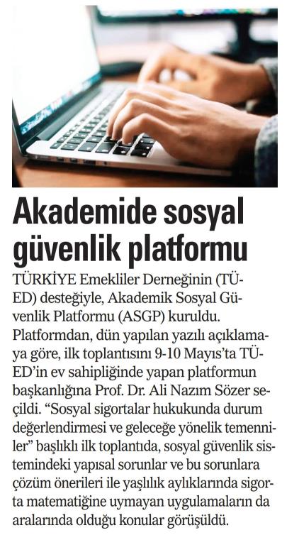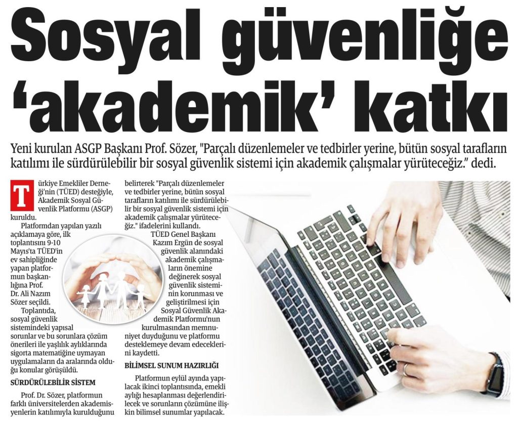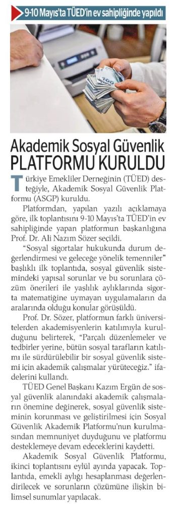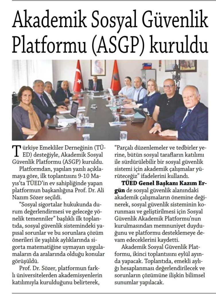 Türkiye’de farklı Üniversitelerde sosyal güvenlikle ilgili konularda çalışma yapan akademisyenler; (Prof. Dr. Ali Nazım Sözer- Prof. Dr. Kadir Arıcı-Prof. Dr. Yusuf Alper-Prof. Dr. Şerife Türcan Özşuca-Prof. Dr. Şenay Gökbayrak-Prof. Dr. Fatih Uşan-Prof. Dr. Levent Akın-Prof. Dr. Mahmut Kabakçı) “Türk Sosyal Güvenlik Sistemi ve Sorunları” ile ilgili tespitler yapmak, çözüm önerileri üretmek üzere bir “Akademik Sosyal Güvenlik Platformu (ASGP)” oluşturmaya karar vermişlerdir. Platform ilk toplantısını 9-10 Mayıs 2024 tarihlerinde, Türkiye Emekliler Derneği (TÜED) ev sahipliğinde, TÜED uzmanlarının da katılımı ile Ankara’da gerçekleştirmiştir. Platform ilk toplantısında; Türk Sosyal Güvenlik Sisteminin temel sorun alanlarını belirleyerek, platformun faaliyetlerine süreklilik kazandırılması kararı alınmıştır.